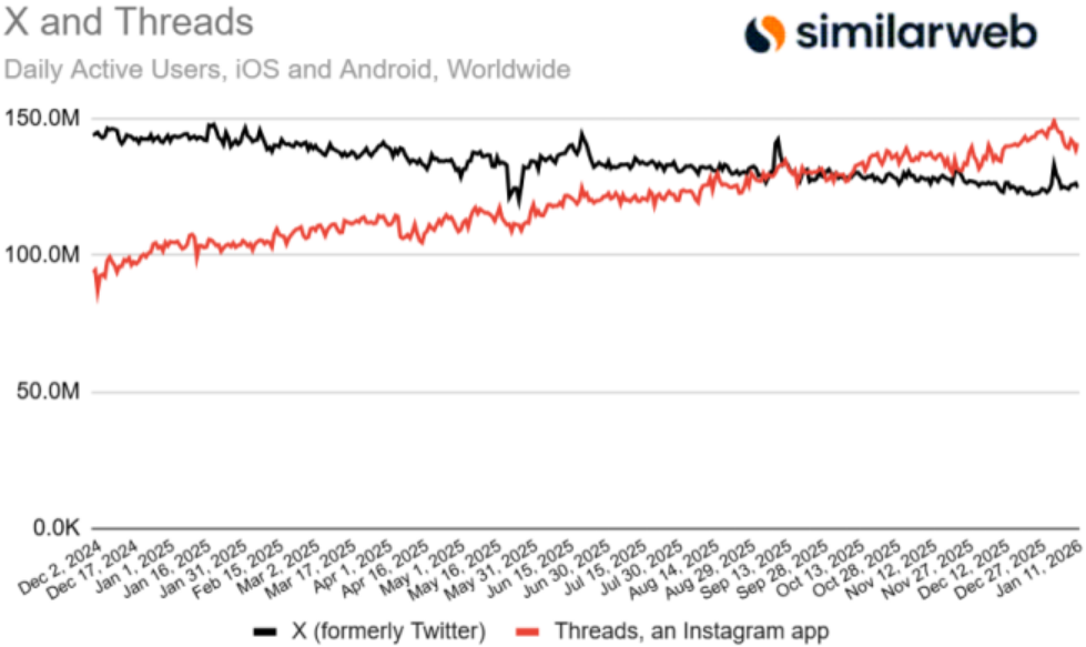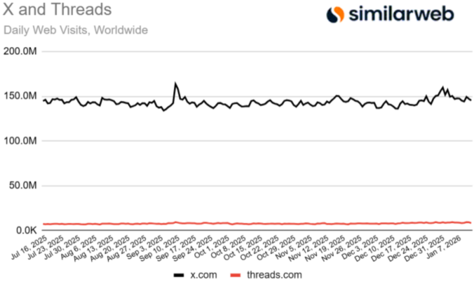 Водночас у США X все ще випереджає Threads, однак розрив поступово зменшується. Рік тому X мав удвічі більше щоденних активних користувачів у США, ніж зараз. Крім того, Threads майже не має значущої аудиторії у вебі, тоді як X утримує відносно стабільний веб-трафік — близько 150 млн щоденних відвідувань. За даними Similarweb, станом на 13 січня X фіксував 145,4 млн щоденних веб-візитів, тоді як Threads мав лише 8,5 млн щоденних веб-візитів сукупно на Threads.com і Threads.net.