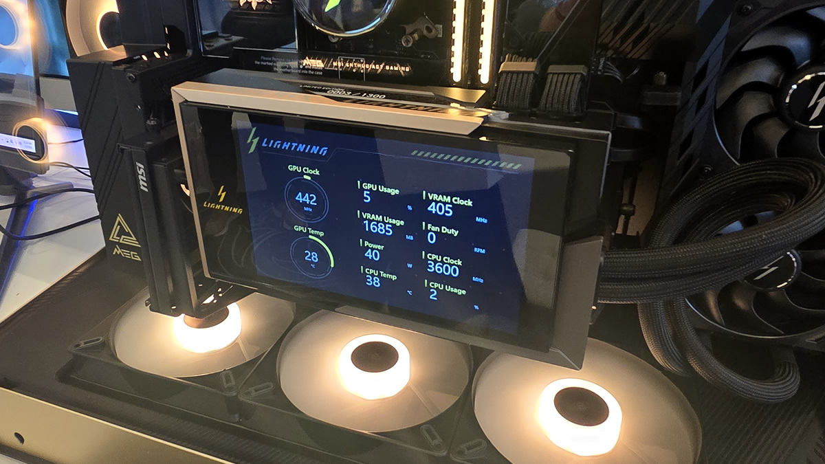 Графічний процесор MSI RTX 5090 Lightning оснащений двома роз’ємами 12 В-2×6 з максимальним обмеженням потужності до 1600 Вт на роз’єм коштом 40-фазної системи VRM. Є також спеціальний BIOS XOC на 2500 Вт для оверлокерів. Замість верхньої задньої панелі встановлений великий 8* екран, що відображує телеметричні дані.