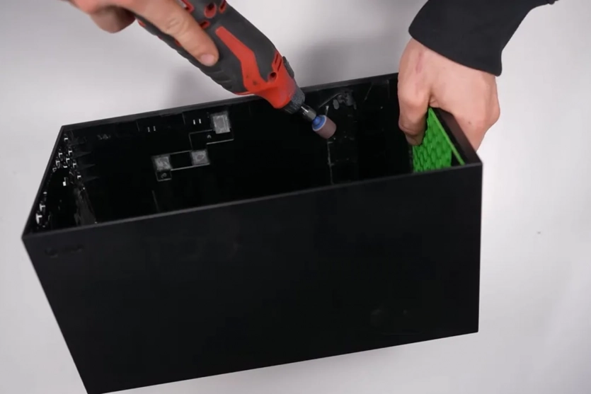 Це, звичайно, не те, що очікуєш побачити. Xbox Series X і так вміщує багато компонентів у компактному корпусі, тому знайти місце для повноцінного ПК-заліза — серйозний виклик. PhasedTech почав із уживаної консолі, повністю видаливши з неї внутрішні компоненти. Далі він використав Dremel, щоб вирізати частину внутрішнього пластику, створивши достатньо місця для встановлення нових компонентів. Замість традиційної материнської плати він обрав Compute Element з лінійки Intel NUC Extreme.