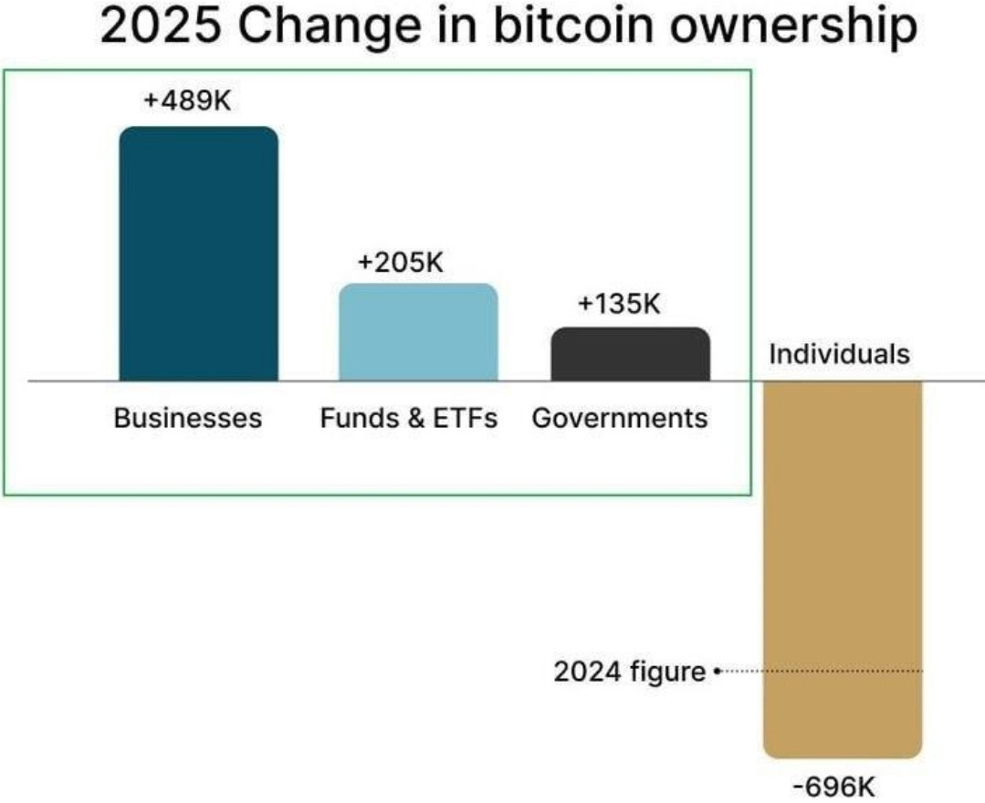 За підсумками 2025 року компанії збільшили свої біткоїн-резерви на 489 тис. BTC, фонди та біржові ETF — на 205 тис. BTC, а уряди — на 135 тис. BTC. Водночас індивідуальні власники скоротили баланси на 696 тис. BTC, що повністю перекриває чистий приріст у корпоративному та державному сегментах. Станом на кінець року приватні власники контролюють близько 13,83 млн BTC (65,9 %), компанії — 1,30 млн BTC (6,2 %), фонди і ETF — 1,63 млн BTC (7,8 %), уряди — 306 тис. BTC (1,5 %). Окремо оцінюється 1,58 млн BTC як втрачені монети, ще близько 1,09 млн BTC залишаються не видобутими. Сукупна частка інституційних власників уже перевищує 13 % загальної пропозиції.