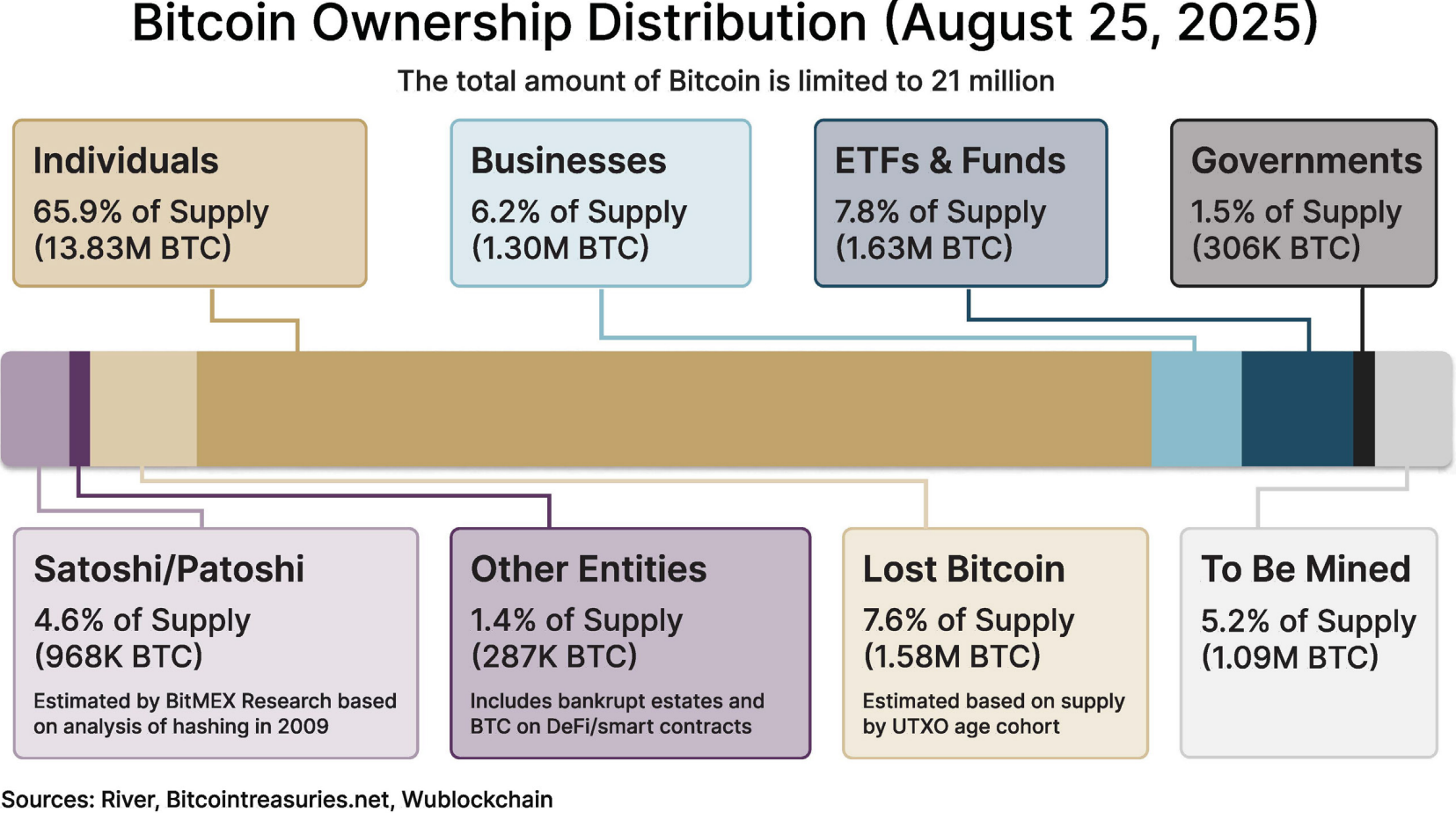 У 2025 році структура володіння біткоїном змістилася в бік великих гравців: компанії, фонди та уряди наростили запаси, тоді як приватні інвестори скоротили частку. За оцінкою River, частка приватних власників знизилася з 69,4 % у кінці 2024 року до 65,9 % у 2025 році ( приблизно 13,83 млн BTC).