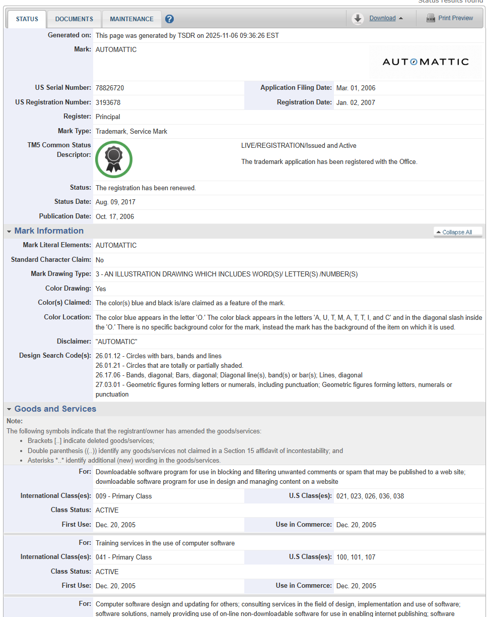Гірі також опублікував відповідь Малленвега, у якій зазначається, що його компанія також володіє automatic.com. Зі свого боку Гірі пояснив, що його компанія має назву AutomaticCSS, оскільки представляє єдиний CSS-фреймворк, що переважно працює автоматично. За даними Бюро з патентів та товарних знаків США, у своїй заявці на реєстрацію торгової марки Automattic вказує слово “automatic” як застереження, що означає нереєстроване слово, “наприклад, формулювання або дизайн, який не вказує на джерело ваших товарів чи послуг або є просто описовим для них”.