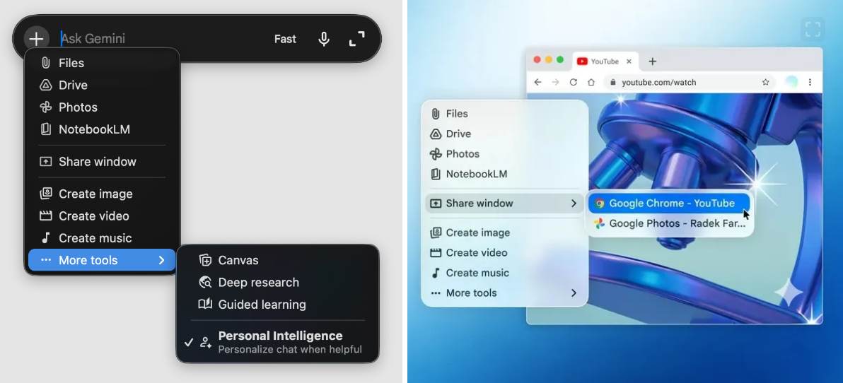 Користувачі отримують панель “Ask Gemini” у формі таблетки з Liquid Glass. Кнопка “Add files and tools” зліва дозволяє завантажувати файли, Drive, Photos і NotebookLM, а також ділитися вікном. Внизу знаходяться інструменти: створення зображень, відео, музики, Canvas, глибоке дослідження, навчання з гідом та Personal Intelligence.